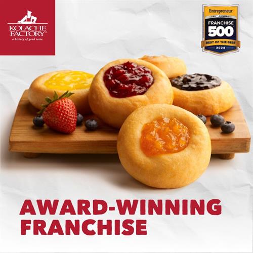 Welcome to Kolache Factory! Founded in 1982, we serve fresh, authentic Eastern European kolaches. Top 5 Drive-Thru (Food Network), Top 50 US Bakery (Modern Baking), Top 20 Bakery-Cafe to Watch (Franchise Times). Made fresh daily with proprietary dough & diverse fillings (meat, cheese, fruit). Convenient, on-the-go food. A proven business success and scalable model. We are excited to service the Huntsville/Madison area!